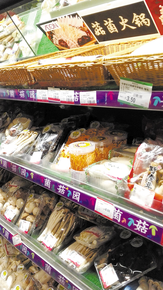 为了配合火锅季的到来,超市蔬菜区域的货架上,几乎有一半的位置让给了各式各样的菌菇,商家还推出了打火锅专用的菌菇拼盘。