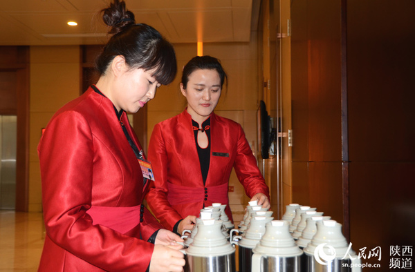 在2016年陕西“两会”召开期间,总能看到身穿黑色旗袍,外套红色工服的女孩们忙碌的身影。她们或推着小车或拎着暖瓶频繁地穿梭于各个会场,亦或是静守在会场门外,引导参会者进场离场。