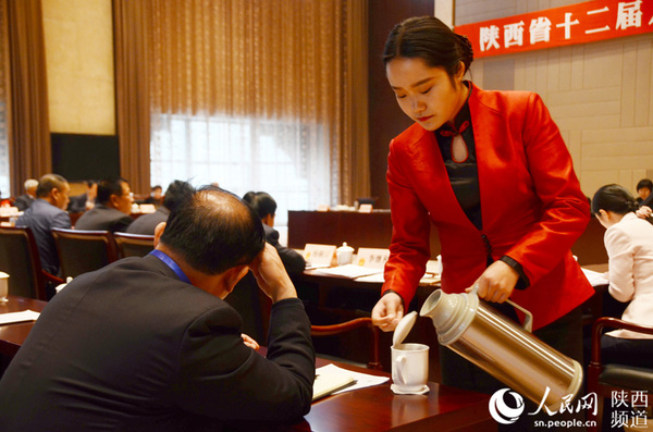 在2016年陕西“两会”召开期间,总能看到身穿黑色旗袍,外套红色工服的女孩们忙碌的身影。她们或推着小车或拎着暖瓶频繁地穿梭于各个会场,亦或是静守在会场门外,引导参会者进场离场。