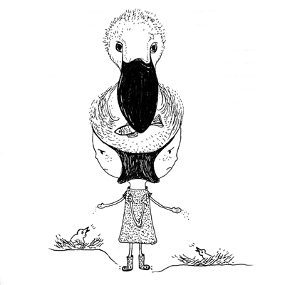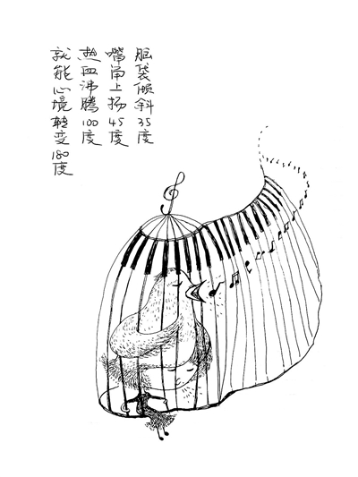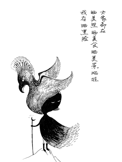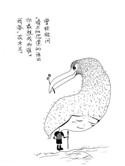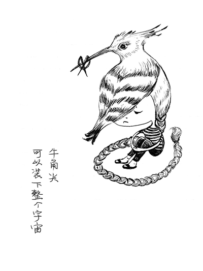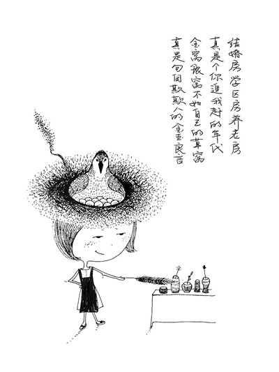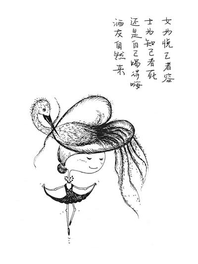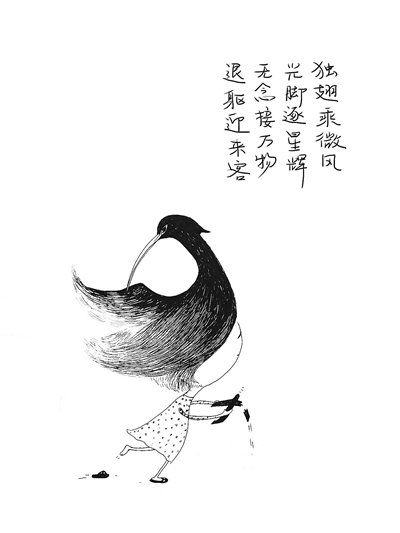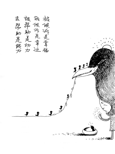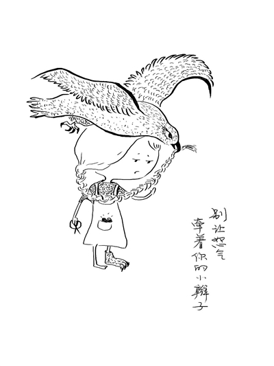 她画的时候不会想太多,往往是下笔勾勒勾勒,我就出来了。先画鸟头,再画小姑娘的动作、神态,笔随心走,我也就千变万化。李贞画我不定时,高兴了画,悲伤了画,有时候开会无聊也会偷偷地画。画完了放下几天,突然有了感慨,再加上几句画龙点睛的话。