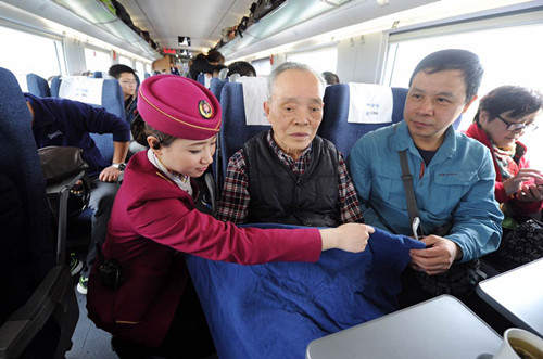 2015年2月24日,列车长高曼和乘务员张君蔚正在高铁列车上与小朋友一起画羊,祈福羊年好运。这是春运期间,为了给“老幼病残孕”等重点旅客提供延伸服务,京广高铁车队“一路心相伴”车组开展“真心、耐心、细心、贴心、热心”的客运服务,用温馨体贴全方位的服务为旅客带来意外惊喜。