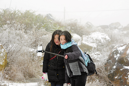 粤北地区降雪,当地最低气温低至零下5℃。坪乳公路上有冰雪,很多人特意前来看雪拍照。