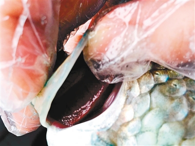 被孔雀石绿浸泡后,鱼鳃颜色变成了紫红色。 记者 窦翊明 摄