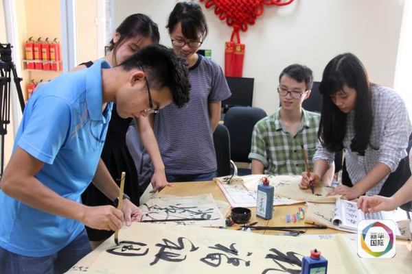 图为2015年9月23日,在越南河内大学的孔子学院,越南中文系学生与中国留学生进行书法交流。(新华社记者乐艳娜摄)