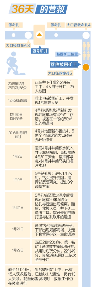 2015年12月30日10时55分,事故发生第五天,好消息终于传来:4号井井底车场发现4名幸存矿工,他们被困在一段约50米长的巷道内。食物、保暖内衣、药品、照明工具等千余件物资迅速通过保命孔投下,3个大口径救命孔也同时紧急开钻。