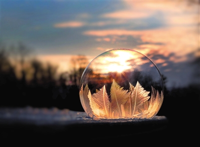 近日,来自美国宾夕法尼亚的女摄影师米歇尔拍摄了一组逆光下的冰冻肥皂泡,美得宛如魔法水晶球。米歇尔在孩子们玩的肥皂泡里加入了些许甘油,以增加其稳定性,然后撒一些雪花或冰晶在一张玻璃面的桌子上,将吹出的泡泡收集起来放在桌面上,对着旭日拍摄下精美的照片。