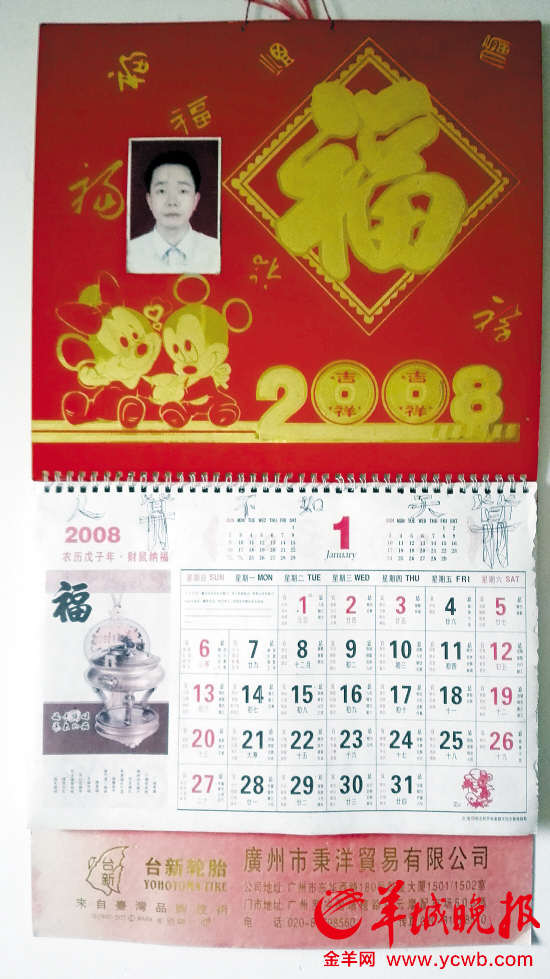 刘纪平的床上,铺着一床红色的被子。对面沙发上,是刘纪平留在家中的全部衣物。房间内没有任何装饰物,抽屉内空空如也,床的正对面墙上,挂着一本2008年的红色挂历。挂历“福”字右边,有一张刘纪平标准的“登记照”。母亲张千连告诉记者,那是他最喜欢的一寸照片,是在河源一家企业打工时拍摄。在被翻开的一月份挂历上部,有圆珠笔清晰写上的6个大字“人算不如天算”。