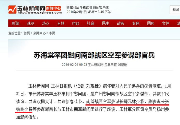 另据湖北省发改委网站披露,2015年11月4日,湖北省委书记李鸿忠,省委常委、常务副省长王晓东,副省长许克振,专程赴广东省广州市拜会了广州军区空军司令员徐安祥等主要领导。郑元林和张铁良分别以广州军区空军参谋长、副参谋长的身份出席活动。