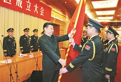 2月1日,习近平向西部战区司令员赵宗岐、政治委员朱福熙授军旗供图/新华社