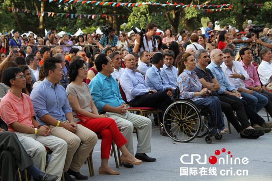 中国驻阿大使杨万明(左四)及使馆主要官员陪同阿副总统(坐轮椅者)等阿根廷政要观看文艺演出