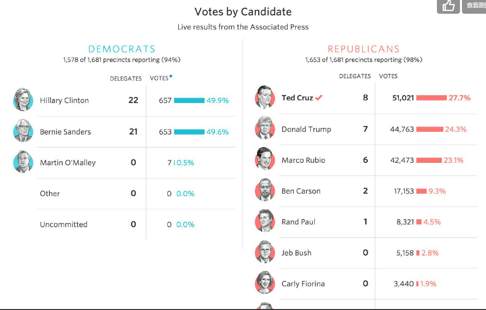 据外媒,在美国爱荷华州已统计的90%选票中,民主党候选人希拉里以0.3%微弱优势险胜桑德斯(Bernie Sanders)。