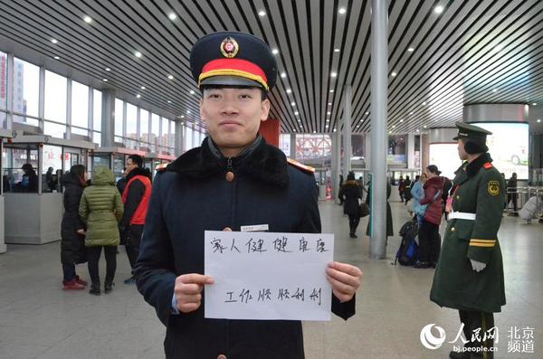 北京西站工作人员武松,来自呼和高特,工作了4年,每年除夕都在岗位上度过,今年也不例外,每当看着回家的人流,想想自己的坚守,有时也有一丝失落感,不过家人都非常支持他的工作,“既然我选择了这个工作,心里就不会后悔”,谈到新年愿望,他写下了这句平常却发自肺腑的话。人民网尹星云 摄
