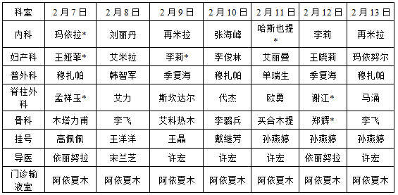 2016年春节期间新疆医科大六附院门诊医师值班表