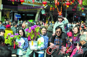 “行花街、过大年”。昨日,城区多个传统迎春花市全面开锣迎客,精彩的迎春花市节庆活动将一直持续至元宵。记者走访发现,各大花市人气大旺,节日氛围浓厚。在带走一盆盆年花年桔、各式年货的同时,“孙悟空”style的各种饰物更是成了行花街年轻人们的“标配”。
