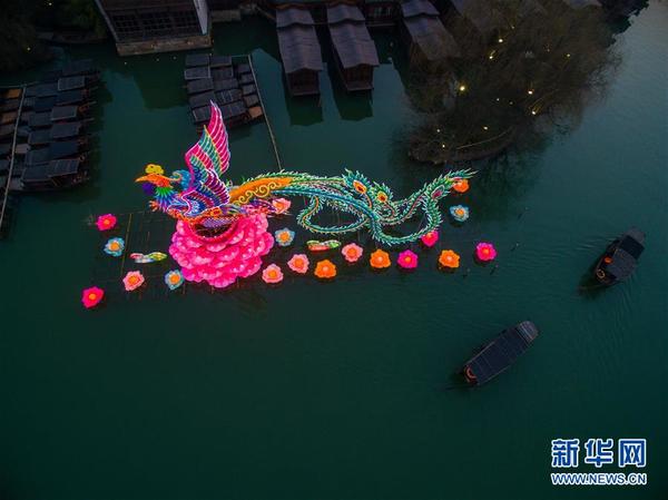 2月5日,大型凤凰彩灯亮相乌镇西栅景区河道上。 新华社记者 徐昱 摄