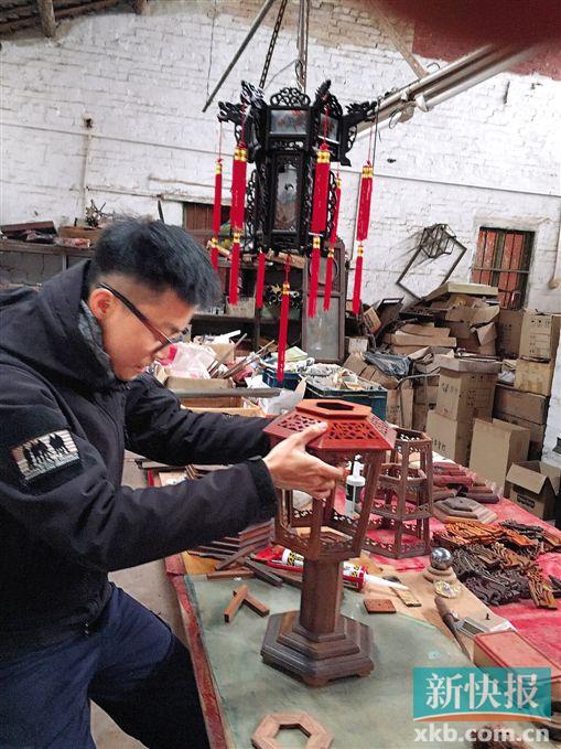 ■罗昭亮师傅在作坊内组装小型红木宫灯。