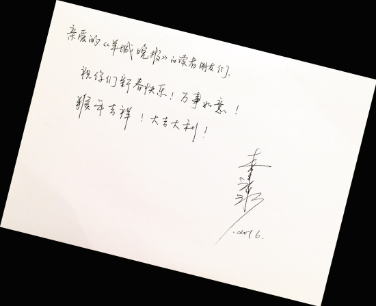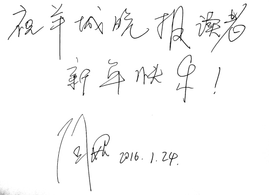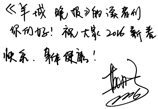 《羊城晚报》的读者们你们好!祝大家2016新春快乐,身体健康! 黄晓明