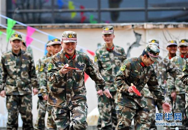 2月8日,西藏公安边防总队吉隆边防检查站监护中队的官兵举办文体活动。大年初一,新华社“新春走基层”采访小分队来到了西藏日喀则市吉隆县吉隆口岸。边防战士全副武装在执勤巡逻,海关、国检工作人员在正常工作,游客和两国边民进出境顺利通畅,秩序井然。经历大地震考验,口岸于去年10月13日恢复通关,对尼贸易快速回暖。西藏公安边防总队吉隆边检站监护中队驻地,悬挂着红灯笼,贴着红对联,战士们正在操场上做游戏:抢凳子、端乒乓球、套圈,宁静的山谷里传来阵阵欢声笑语。新华社记者张汝峰摄