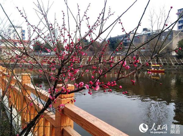 人民网枝江2月10日电 2月9日,湖北省枝江市五柳公园梅花绽放,喜迎新春佳节。温暖的阳光破云而出,垂柳青青、小鸟喳喳、水浪涟涟。人们赏花观景,湖水荡舟,春姑娘乐滋滋的。(刘卫东)