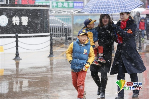 对于车站工作人员来说,大雪更无浪漫可言。为做好大雪天气旅客运输组织工作,车站在进出站口、站台、地道台阶等客流密集处铺设防滑垫,增加改签、退票窗口,增设中转换乘区,确保旅客顺利改签换乘。另外,车站大学生青年志愿者、驻站武警以及车站帮班服务小分队提前到岗到位,全面做好重点旅客帮扶工作。为应对返程高峰期,济南火车站还增开了去往北京、上海、哈尔滨等方向的临客11对。图为客运值班员持伞接引将乘车的母子三人。中国青年网通讯员曹大凡 摄