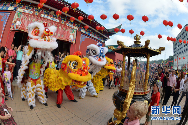文莱华人表演舞狮舞龙。为庆祝中国猴年新春,文莱华人社团初一和初二在华人庙宇腾云殿以及街道上舞龙舞狮吸引了众多文莱人和外国游客驻足观看、拍照,一派喜气洋洋的过年气氛。新华社发(杰弗里·黄 摄)