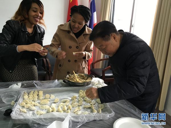 包饺子。春节前夕,林占熺教授在国家菌草中心和菌草班的留学生们共度春节。新华网王文清摄