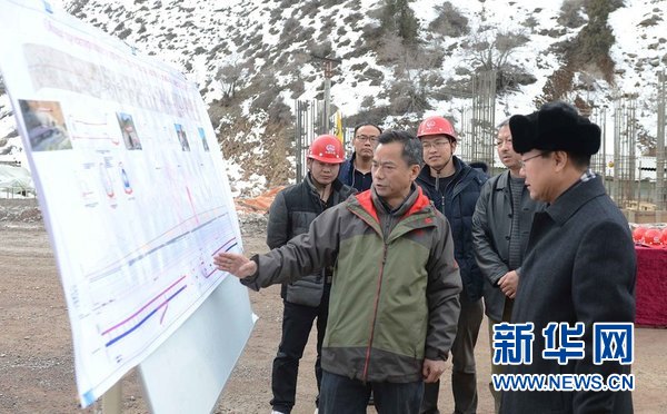 2月8日,农历大年初一,乌兹别克斯坦安琶铁路卡姆奇克隧道西口分部现场,中铁隧道集团有限公司副总工程师兼乌兹别克斯坦铁路隧道项目经理周校光向中国驻乌使馆孙立杰大使介绍隧道施工进展情况。