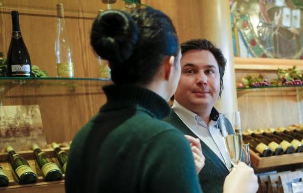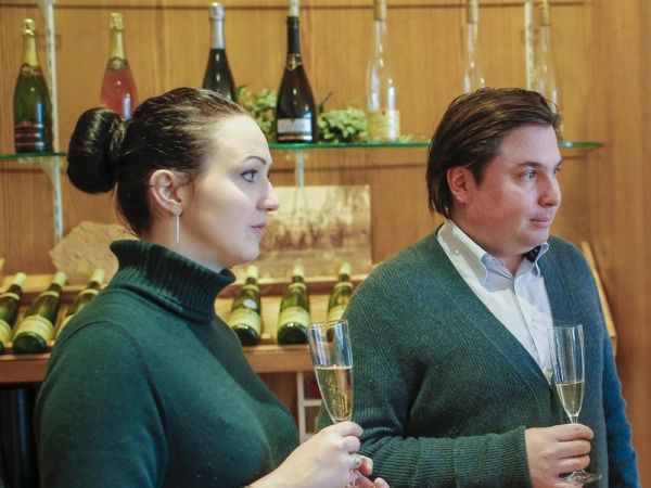 2月13日,在法国东部阿尔萨斯地区的弗格林索芬,法国约瑟夫·卡坦酒庄的第13代传人小雅克·卡坦与妻子安娜依斯接受新华社记者的采访。