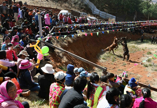 2月13日,寻甸老村群众在观看斗马比赛。当日是农历大年初六,地处偏远山区的云南省寻甸回族彝族自治县甸沙乡老村各族群众举行斗牛斗马比赛,欢度猴年新春佳节。新华社记者 杨宗友/摄