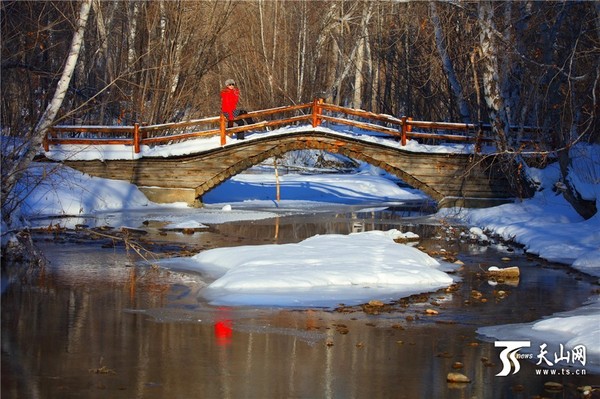 天山网讯(特约记者刘是何摄影报道)2月14日,春天的微风已吹到西北边陲新疆哈巴河县白桦林,冰封了一冬天的河水开始解冻,迎春踏雪的人们走进桦林寻春、赏景、拍照,一群骆驼在哈巴河边悠闲地觅食。这桦林、小桥、流水、骆驼和走进桦林的踏春人构成了一幅幅美丽的迎春、踏春画卷。