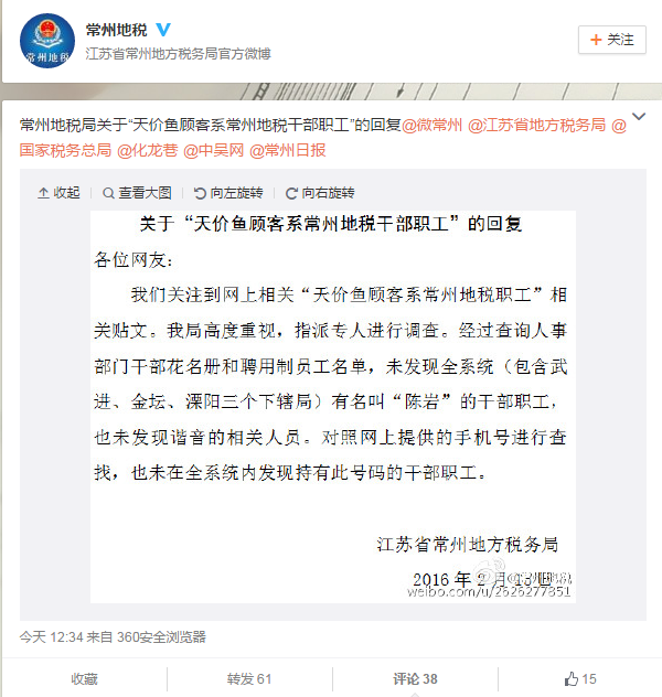 2月15日,@常州地税发布关于“天价鱼顾客系常州地税干部职工”的回复通知。通知称,常州地税局关注到网上相关“天价鱼顾客系常州地税干部职工”相关贴文。经查询人事部门干部花名册和聘用制员工名单,未发现全系统有名叫“陈岩”的干部职工,也未发现谐音的相关人员。对照网上提供的手机号进行查找,也未在全系统内发现持有此号码的干部职工。