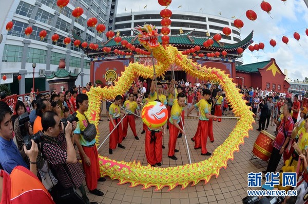 文莱华人表演舞狮舞龙。为庆祝中国猴年新春,文莱华人社团初一和初二在华人庙宇腾云殿以及街道上舞龙舞狮吸引了众多文莱人和外国游客驻足观看、拍照,一派喜气洋洋的过年气氛。新华社发(杰弗里·黄摄)