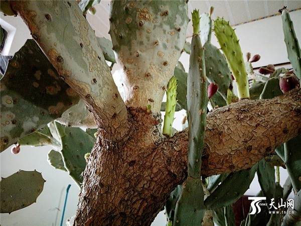 天山网讯(特约记者王波 刘凯摄影报道)2月16日,新疆巴州焉耆县四十里城子镇一盆高1.8米、占地3余平方米、开着鲜花、长着丰硕果实的巨型仙人掌吸引了众人前来观赏。