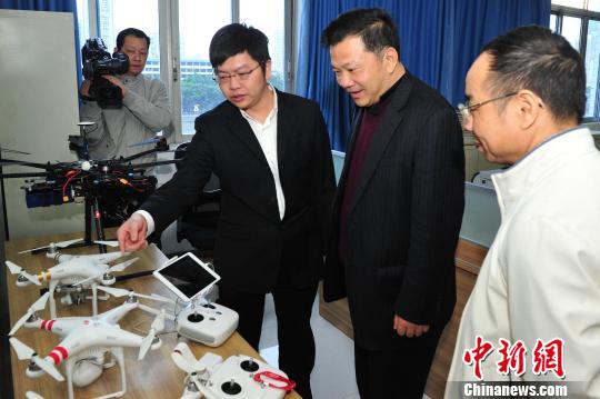 中新社广东分社社长张见悦(右三)向广东省委常委、宣传部长慎海雄(右二)介绍采访用无人机设备 陈骥旻 摄
