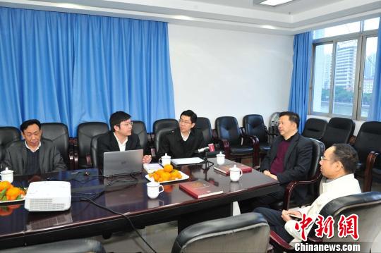 中新社广东分社社长张见悦(左二)向广东省委常委、宣传部长慎海雄(右二)介绍新的一年工作设想和方向 陈骥旻 摄