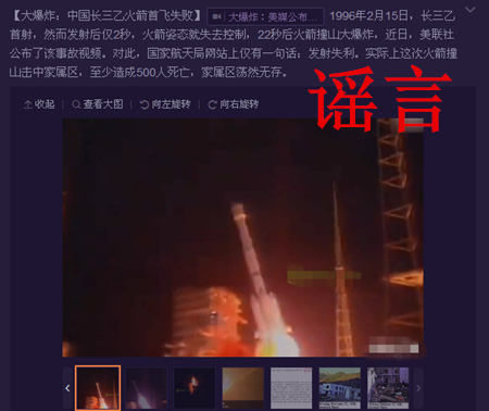 网络传言称,“1996年2月15日,长三乙首射,然而发射后仅2秒,火箭姿态就失去控制,22秒后火箭撞山大爆炸,近日,美联社公布了该事故视频。对此,国家航天局网站上仅有一句话:发射失利。实际上这次火箭撞山击中家属区,至少造成500人死亡,家属区荡然无存。”