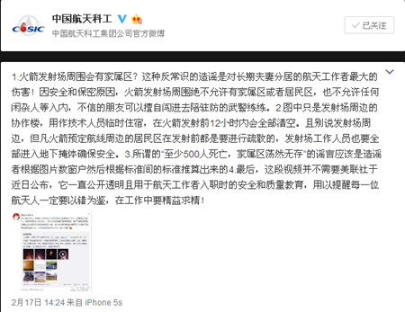 针对网络上的传言,17日,中国航天科工集团公司在其官方微博“中国航天科工”进行了回应:
