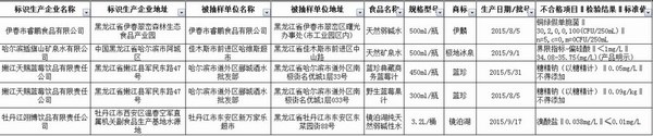 据悉,黑龙江省食品药品监督管理局此次抽检,在伊春市睿鹏食品有限公司生产的伊麟天然弱碱水中检出铜绿假单胞菌;在哈尔滨插旗山矿泉水有限公司生产的极地冰泉天然矿泉水中检出界限指标-偏硅酸指标不达标;在嫩江天赐蓝莓饮品有限责任公司生产的蓝珍典藏商务蓝莓汁中检出不得添加的糖精钠(以糖精计);在嫩江天赐蓝莓饮品有限责任公司生产的蓝珍野生蓝莓果汁中检出不得添加的糖精钠(以糖精计);在牡丹江翊博饮品有限责任公司生产的镜泊湖纯天然弱碱性水中检出溴酸盐指标超标。