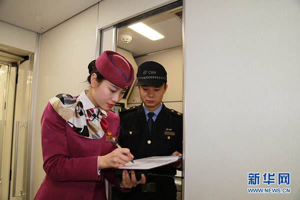 2016年2月17日,重庆,重庆客运段动车二队热备列车长罗娜和重庆车辆段机械师周子良在对列车设备进行确认后,对列车设备设施情况签字。新华网发 苏志刚 摄