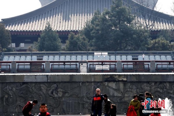 2月18日,在大雁塔音乐喷泉广场南侧高台,临近喷泉处皆被护栏围起并禁止行人进入,护栏内摆放了300余个座位,费用为30元每人。据了解,大雁塔音乐喷泉自2003年建成后,免费向游客开放,每年吸引大量游人。