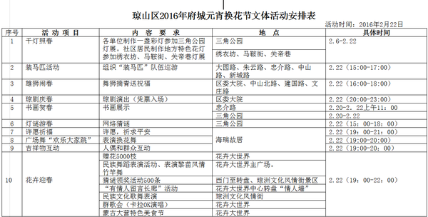 人民网海南视窗海口2月19日电 2月19日下午,记者从海口市琼山区区委区政府召开的新闻通气会上获悉,今年2月22日是农历正月十五,也是琼山区府城镇一年一度最独具地方特色的“换花节”。为此,琼山区从春节期间至正月十五,准备了一系列市民参与性强、民俗特色浓郁的节庆活动。(孟凡盛)