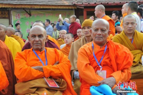 2月19日,两位外国僧人在法会上。当日,中国南传佛教在云南西双版纳举行帕松列和帕祜巴升座庆典法会。中国佛教协会副会长祜巴龙庄勐长老升座为帕松列,都罕听等五位长老升座为帕祜巴。 此次帕松列和帕祜巴升座庆典法会,距1956年中国佛教协会会长喜饶嘉措为西双版纳总佛寺大长老祜巴勐晋升为松列·阿戛牟尼已经60年。纳总佛寺大长老祜巴勐晋升为松列·阿戛牟尼已经60年。 中新社记者 王艳龙 摄