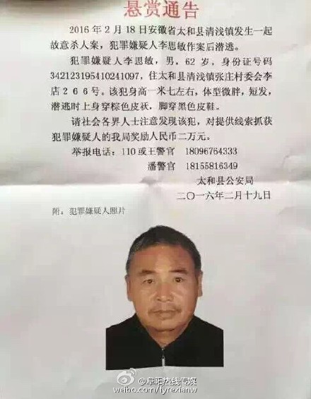 安徽太和县发生故意杀人案 警方悬赏两万缉拿嫌犯