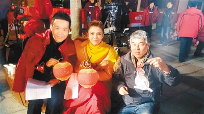 民俗专家王智(右)为央视元宵晚会西安分会场主持人朱迅和徐杰(左)讲解西安花灯民俗文化 记者 尚洪涛 摄