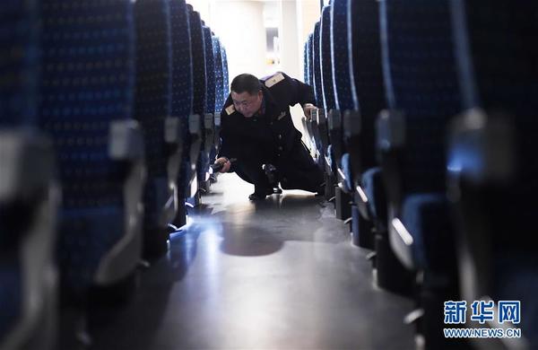 2月23日,赵金在检查动车车厢内的地面卫生。