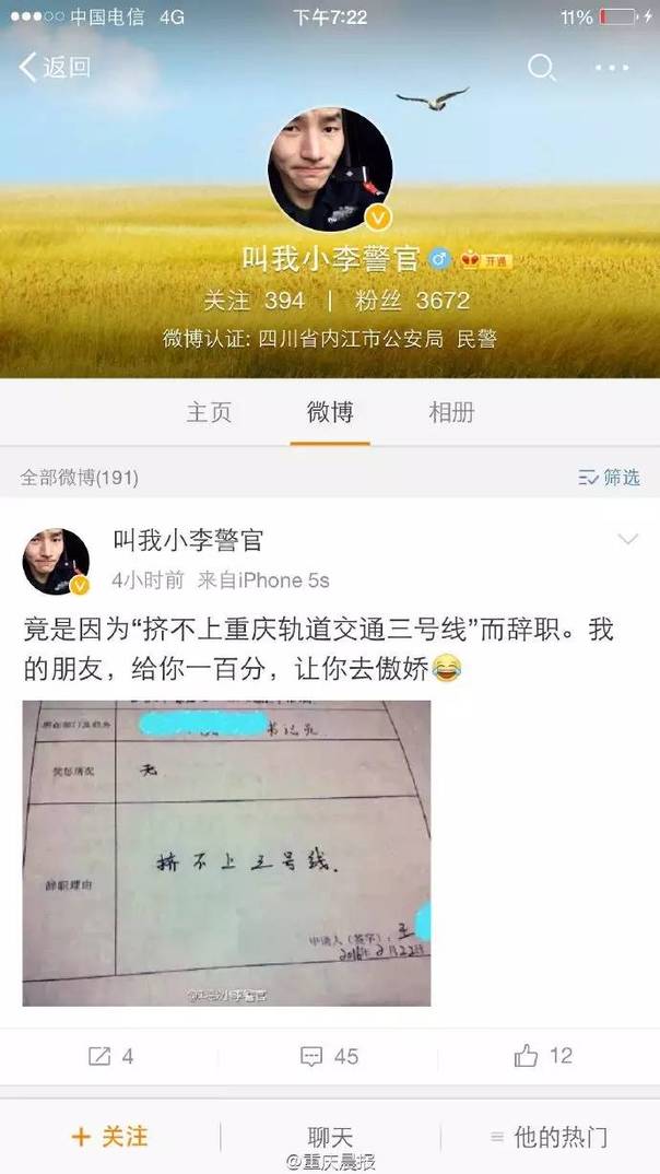 23日下午,网友@叫我小李警官发布微博称:“竟是因为“挤不上重庆轨道交通三号线”而辞职。我的朋友,给你一百分,让你去傲娇。”
