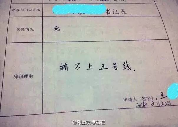 微博还附上了一张辞职申请表格的照片。在辞职理由一栏上写着:“挤不上三号线”。