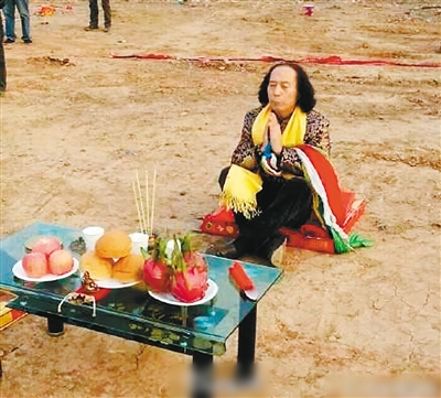 记者在网络附图中看到,洛阳市政集团东环路跨洛河大桥工程项目部,一长发男子在放有水果和几柱香的茶几前正襟危坐,双手合十,貌似正在虔诚祈祷。