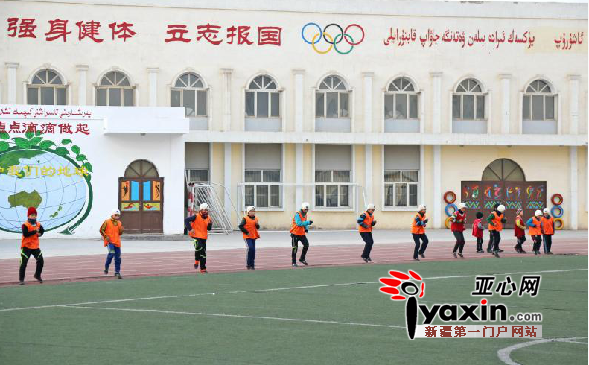 喀什市第十八小学里现代化体育设施让孩子们对体育运动充满兴趣。图为该校足球队在训练。亚心网记者吴卉摄