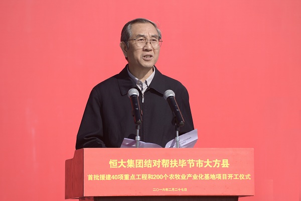 猴年刚刚到来,恒大集团就已经迈出了2016年的第一步!2月27日,恒大集团结对帮扶大方县首批援建工程项目开工仪式在毕节市大方县举行,40项重点工程和200个农牧业产业化基地项目同时正式开工。全国政协副主席马飚,全国政协常委、经济委员会主任周伯华,全国政协常委、人口资源环境委员会副主任李成玉;全国政协常委、恒大集团董事局主席许家印,总裁夏海钧;贵州省委书记、省人大常委会主任陈敏尔,省长孙志刚,省政协主席王富玉,毕节市委书记陈志刚,市长陈昌旭等领导纷纷出席了这一盛大且极具意义的活动。